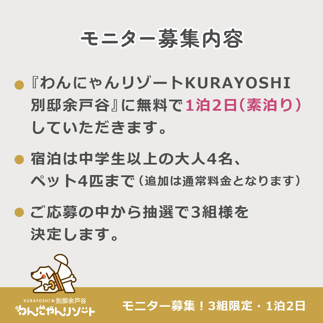 ペットとお泊まりいただける無料宿泊モニター募集!