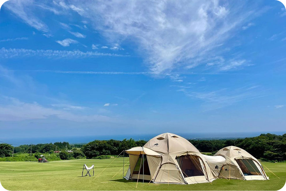 名峰大山と日本海の間、標高300mに広がる芝畑で、一日一組限定のグランピング。